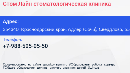 Стом Лайн, стоматологическая клиника по адресу 354340, Краснодарский край, Адлер (Сочи), Свердлова, 55 в дальнейшем Организация, размещена в следующих категориях: