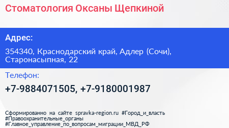 Стоматология Оксаны Щепкиной по адресу 354340, Краснодарский край, Адлер (Сочи), Старонасыпная, 22 в дальнейшем Организация, размещена в следующих категориях:
