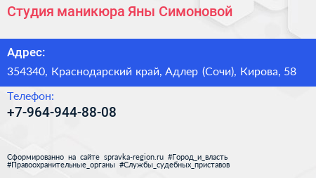 Студия маникюра Яны Симоновой по адресу 354340, Краснодарский край, Адлер (Сочи), Кирова, 58 в дальнейшем Организация, размещена в следующих категориях: