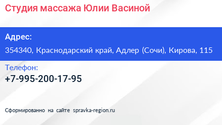 Студия массажа Юлии Васиной по адресу 354340, Краснодарский край, Адлер (Сочи), Кирова, 115 в дальнейшем Организация, размещена в следующих категориях: