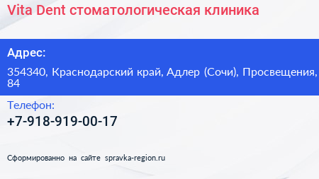 Vita-Dent, стоматологическая клиника по адресу 354340, Краснодарский край, Адлер (Сочи), Просвещения, 84 в дальнейшем Организация, размещена в следующих категориях: