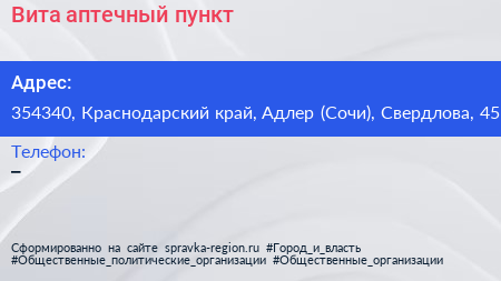 Вита, аптечный пункт по адресу 354340, Краснодарский край, Адлер (Сочи), Свердлова, 45 в дальнейшем Организация, размещена в следующих категориях:
