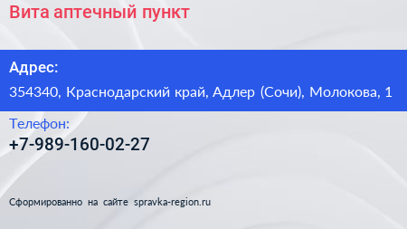 Вита, аптечный пункт по адресу 354340, Краснодарский край, Адлер (Сочи), Молокова, 1 в дальнейшем Организация, размещена в следующих категориях: