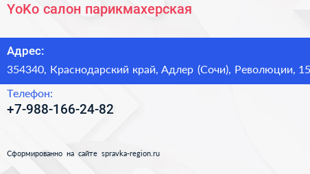 YoKo, салон-парикмахерская по адресу 354340, Краснодарский край, Адлер (Сочи), Революции, 15 в дальнейшем Организация, размещена в следующих категориях: