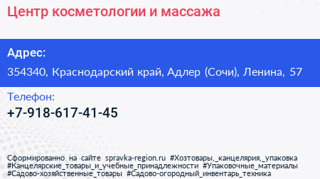 Центр косметологии и массажа по адресу 354340, Краснодарский край, Адлер (Сочи), Ленина, 57 в дальнейшем Организация, размещена в следующих категориях: