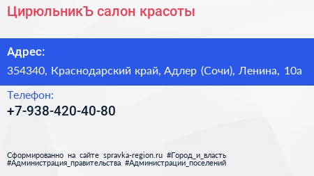 ЦирюльникЪ, салон красоты по адресу 354340, Краснодарский край, Адлер (Сочи), Ленина, 10а в дальнейшем Организация, размещена в следующих категориях: