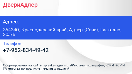 ДвериАдлер по адресу 354340, Краснодарский край, Адлер (Сочи), Гастелло, 30а/6 в дальнейшем Организация, размещена в следующих категориях: