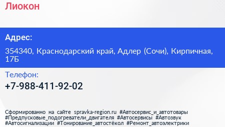 Лиокон по адресу 354340, Краснодарский край, Адлер (Сочи), Кирпичная, 17Б в дальнейшем Организация, размещена в следующих категориях:
