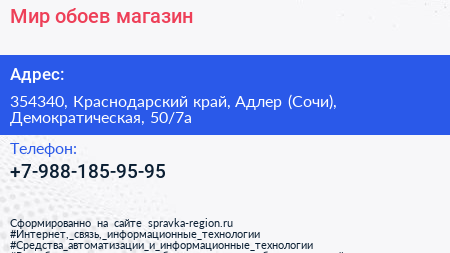 Мир обоев, магазин по адресу 354340, Краснодарский край, Адлер (Сочи), Демократическая, 50/7а в дальнейшем Организация, размещена в следующих категориях: