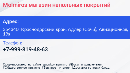 Molmiros, магазин напольных покрытий по адресу 354340, Краснодарский край, Адлер (Сочи), Авиационная, 19а в дальнейшем Организация, размещена в следующих категориях: