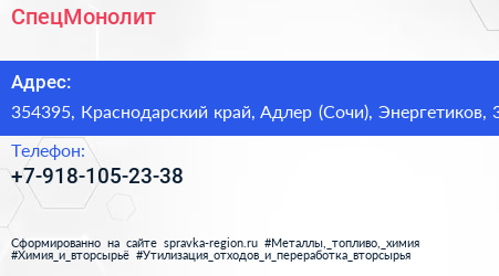 СпецМонолит по адресу 354395, Краснодарский край, Адлер (Сочи), Энергетиков, 3 в дальнейшем Организация, размещена в следующих категориях: