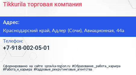 Tikkurila, торговая компания по адресу Краснодарский край, Адлер (Сочи), Авиационная, 44а в дальнейшем Организация, размещена в следующих категориях: