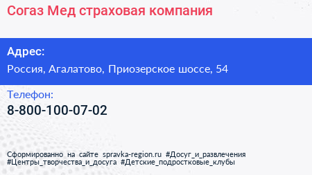 Согаз-Мед, страховая компания по адресу Токсовская межрайонная больница, амбулатория Вартемяги, 54, Приозерское шоссе, Вартемяги, Агалатовское сельское поселение, Всеволожский район, Ленинградская область, Северо-Западный федеральный округ, 188653, Россия в дальнейшем Организация, размещена в следующих категориях: