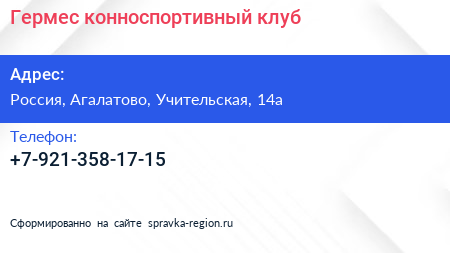 Гермес, конноспортивный клуб по адресу улица Верхняя, массив Вартемяги-1, Агалатовское сельское поселение, Всеволожский район, Ленинградская область, Северо-Западный федеральный округ, 188653, Россия в дальнейшем Организация, размещена в следующих категориях: