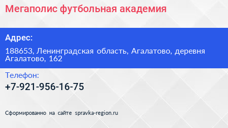 Мегаполис, футбольная академия по адресу 188653, Ленинградская область, Агалатово, деревня Агалатово, 162 в дальнейшем Организация, размещена в следующих категориях:
