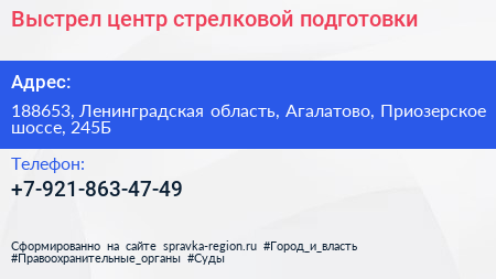 Выстрел, центр стрелковой подготовки по адресу 188653, Ленинградская область, Агалатово, Приозерское шоссе, 245Б в дальнейшем Организация, размещена в следующих категориях: