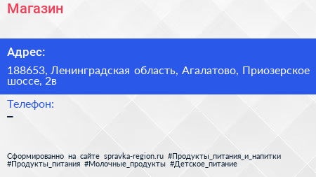 Магазин по адресу 188653, Ленинградская область, Агалатово, Приозерское шоссе, 2в в дальнейшем Организация, размещена в следующих категориях:
