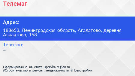 Телемаг по адресу 188653, Ленинградская область, Агалатово, деревня Агалатово, 158 в дальнейшем Организация, размещена в следующих категориях:
