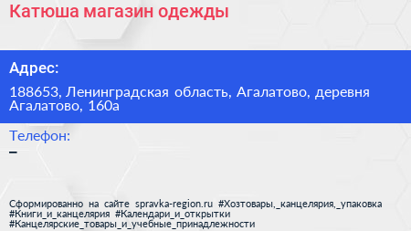 Катюша, магазин одежды по адресу 188653, Ленинградская область, Агалатово, деревня Агалатово, 160а в дальнейшем Организация, размещена в следующих категориях: