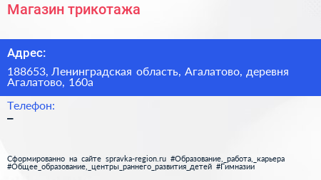Магазин трикотажа по адресу 188653, Ленинградская область, Агалатово, деревня Агалатово, 160а в дальнейшем Организация, размещена в следующих категориях: