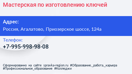 Мастерская по изготовлению ключей по адресу 124А, Приозерское шоссе, ЖК «Шуваловский парк», Вартемяги, Агалатовское сельское поселение, Всеволожский район, Ленинградская область, Северо-Западный федеральный округ, 188653, Россия в дальнейшем Организация, размещена в следующих категориях: