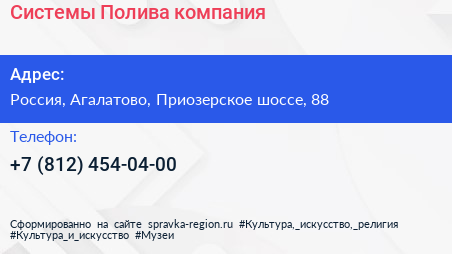 Системы Полива, компания по адресу 88, Приозерское шоссе, ЖК «Шуваловский парк», Вартемяги, Агалатовское сельское поселение, Всеволожский район, Ленинградская область, Северо-Западный федеральный округ, 188653, Россия в дальнейшем Организация, размещена в следующих категориях: