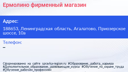 Ермолино, фирменный магазин по адресу 188653, Ленинградская область, Агалатово, Приозерское шоссе, 10а в дальнейшем Организация, размещена в следующих категориях: