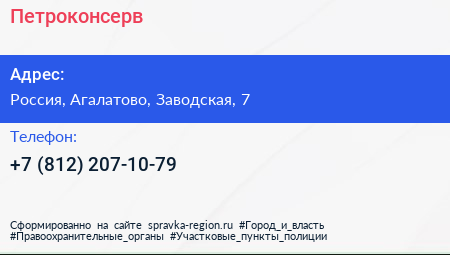 Петроконсерв по адресу 7, Заводская улица, Лесопилка, Агалатовское сельское поселение, Всеволожский район, Ленинградская область, Северо-Западный федеральный округ, 188653, Россия в дальнейшем Организация, размещена в следующих категориях: