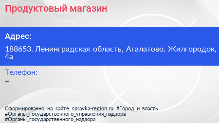 Продуктовый магазин по адресу 188653, Ленинградская область, Агалатово, Жилгородок, 4а в дальнейшем Организация, размещена в следующих категориях: