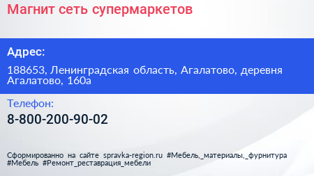 Магнит, сеть супермаркетов по адресу 188653, Ленинградская область, Агалатово, деревня Агалатово, 160а в дальнейшем Организация, размещена в следующих категориях: