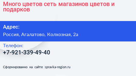Много цветов, сеть магазинов цветов и подарков по адресу Много цветов, 2А, Колхозная улица, ЖК «Шуваловский парк», Вартемяги, Агалатовское сельское поселение, Всеволожский район, Ленинградская область, Северо-Западный федеральный округ, 188653, Россия в дальнейшем Организация, размещена в следующих категориях: