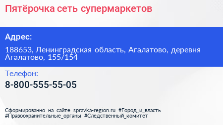 Пятёрочка, сеть супермаркетов по адресу 188653, Ленинградская область, Агалатово, деревня Агалатово, 155/154 в дальнейшем Организация, размещена в следующих категориях: