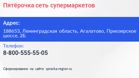 Пятёрочка, сеть супермаркетов по адресу 188653, Ленинградская область, Агалатово, Приозерское шоссе, 2Б в дальнейшем Организация, размещена в следующих категориях: