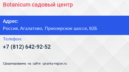 Botanicum, садовый центр по адресу Садовый центр "Botanicum", Советская улица, ЖК «Шуваловский парк», Вартемяги, Агалатовское сельское поселение, Всеволожский район, Ленинградская область, Северо-Западный федеральный округ, 188653, Россия в дальнейшем Организация, размещена в следующих категориях: