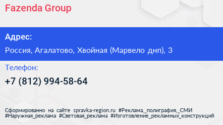 Fazenda Group по адресу Хвойная улица, Коттеджный поселок Киссолово, Лесколовское сельское поселение, Всеволожский район, Ленинградская область, Северо-Западный федеральный округ, Россия в дальнейшем Организация, размещена в следующих категориях: