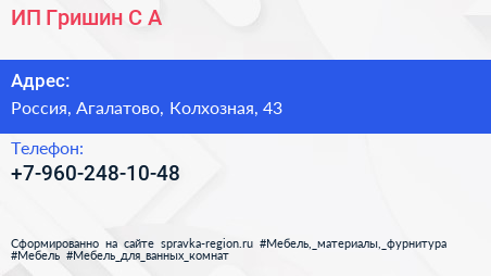ИП Гришин С.А. по адресу 43, Колхозная улица, ЖК «Шуваловский парк», Вартемяги, Агалатовское сельское поселение, Всеволожский район, Ленинградская область, Северо-Западный федеральный округ, 188653, Россия в дальнейшем Организация, размещена в следующих категориях: