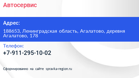 Автосервис по адресу 188653, Ленинградская область, Агалатово, деревня Агалатово, 178 в дальнейшем Организация, размещена в следующих категориях: