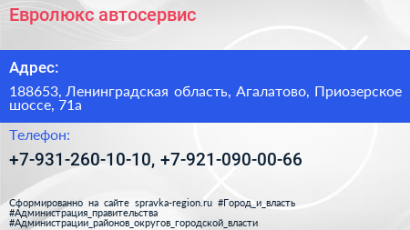 Евролюкс, автосервис по адресу 188653, Ленинградская область, Агалатово, Приозерское шоссе, 71а в дальнейшем Организация, размещена в следующих категориях: