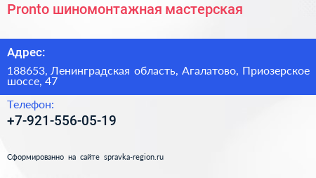 Pronto, шиномонтажная мастерская по адресу 188653, Ленинградская область, Агалатово, Приозерское шоссе, 47 в дальнейшем Организация, размещена в следующих категориях: