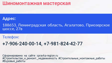 Шиномонтажная мастерская по адресу 188653, Ленинградская область, Агалатово, Приозерское шоссе, 27в в дальнейшем Организация, размещена в следующих категориях:
