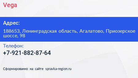 Vega по адресу 188653, Ленинградская область, Агалатово, Приозерское шоссе, 98 в дальнейшем Организация, размещена в следующих категориях: