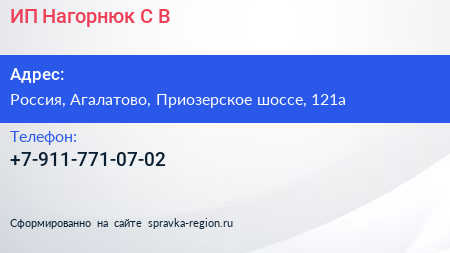 ИП Нагорнюк С.В. по адресу Хозяин, 121А, Приозерское шоссе, ЖК «Шуваловский парк», Вартемяги, Агалатовское сельское поселение, Всеволожский район, Ленинградская область, Северо-Западный федеральный округ, 188653, Россия в дальнейшем Организация, размещена в следующих категориях: