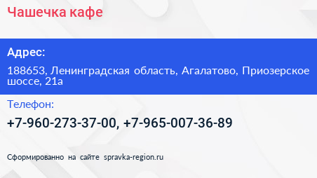 Чашечка, кафе по адресу 188653, Ленинградская область, Агалатово, Приозерское шоссе, 21а в дальнейшем Организация, размещена в следующих категориях: