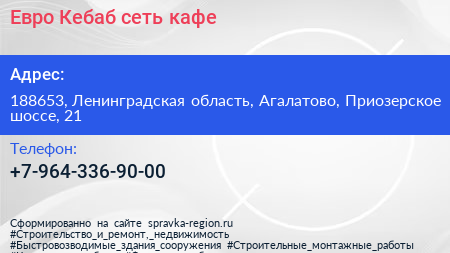 Евро Кебаб, сеть кафе по адресу 188653, Ленинградская область, Агалатово, Приозерское шоссе, 21 в дальнейшем Организация, размещена в следующих категориях: