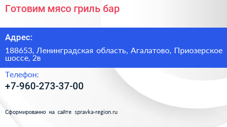 Готовим мясо, гриль-бар по адресу 188653, Ленинградская область, Агалатово, Приозерское шоссе, 2в в дальнейшем Организация, размещена в следующих категориях: