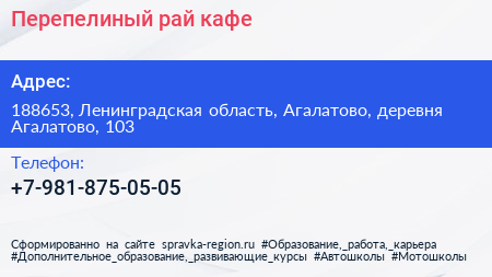 Перепелиный рай, кафе по адресу 188653, Ленинградская область, Агалатово, деревня Агалатово, 103 в дальнейшем Организация, размещена в следующих категориях: