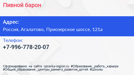 Пивной барон по адресу Хозяин, 121А, Приозерское шоссе, ЖК «Шуваловский парк», Вартемяги, Агалатовское сельское поселение, Всеволожский район, Ленинградская область, Северо-Западный федеральный округ, 188653, Россия в дальнейшем Организация, размещена в следующих категориях: