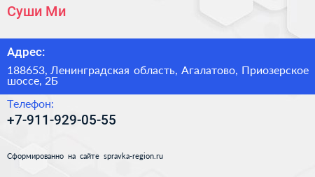 Суши Ми по адресу 188653, Ленинградская область, Агалатово, Приозерское шоссе, 2Б в дальнейшем Организация, размещена в следующих категориях: