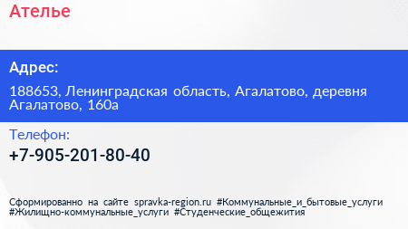 Ателье по адресу 188653, Ленинградская область, Агалатово, деревня Агалатово, 160а в дальнейшем Организация, размещена в следующих категориях: