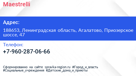 Maestrelli по адресу 188653, Ленинградская область, Агалатово, Приозерское шоссе, 47 в дальнейшем Организация, размещена в следующих категориях: